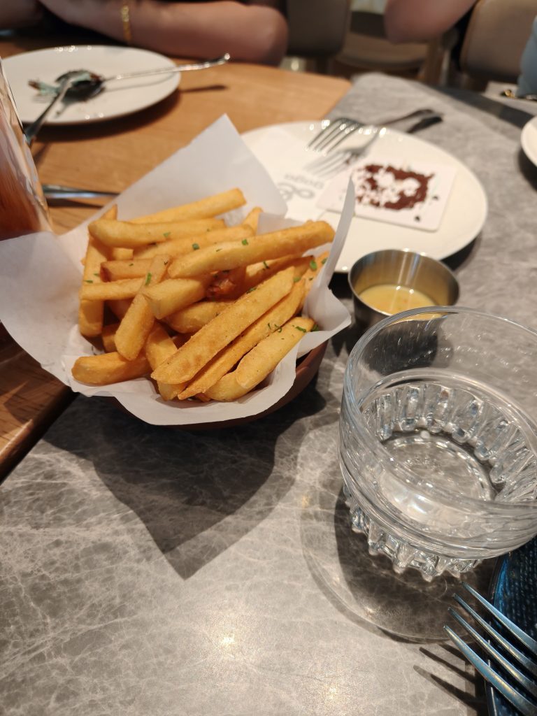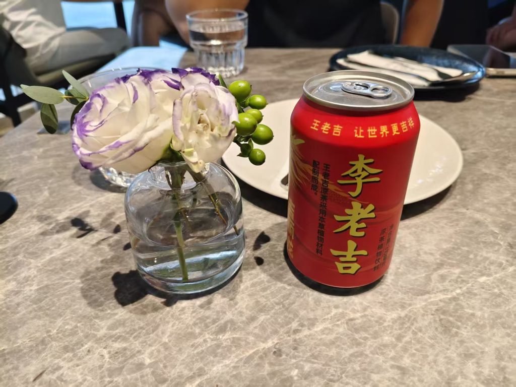 到了奈雪的茶,发现曹伟业被夹在中间坐着,周围也没有位置了。然后华姐冒出来打招呼,我去,刚才一点都没认出来,瘦了又更美了。看了一下周围的咖啡店,好像也没什么合适的。就去了一家吃西餐的咖啡店(gaga)坐坐。曹伟业给樱花送了王老吉,妥妥的专属定制。点了薯条,还有喝的。大家一致觉得薯条好吃,然后大众点评好评又送了几份,吃到饱。