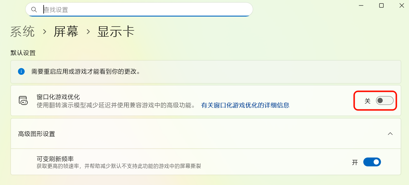 后来再找了一下原因,发现是MPO的问题导致的,大概就是微软挖的坑。大家可以前往系统设置里面,关闭。再加上注册表禁用,应该就稳妥解决了。